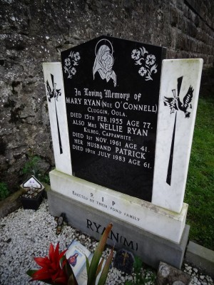 In loving memory of Mary Ryan (nee O'Connell) Cluggin, Oola Died 15th Feb. 1955 Age 77 Also Mrs. Nellie Ryan Kilbeg, Cappawhite Died 1st Nov 1961 Age 41 Her husband Patrick Died 19th July 1983 age 61 RIP Erected by their fond family