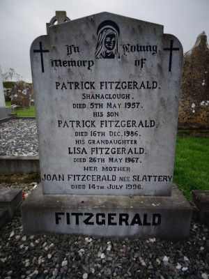 In loving memory of Patrick Fitzgerald Shanaclough Died 5th May 1957 His son Patrick Fitzgerald Died 16th Dec 1986 His grandaughter Lisa Fitzgerald Died 26th May 1967 Her Mother Joan Fitzgerald nee Slattery Died 14th July 1996
