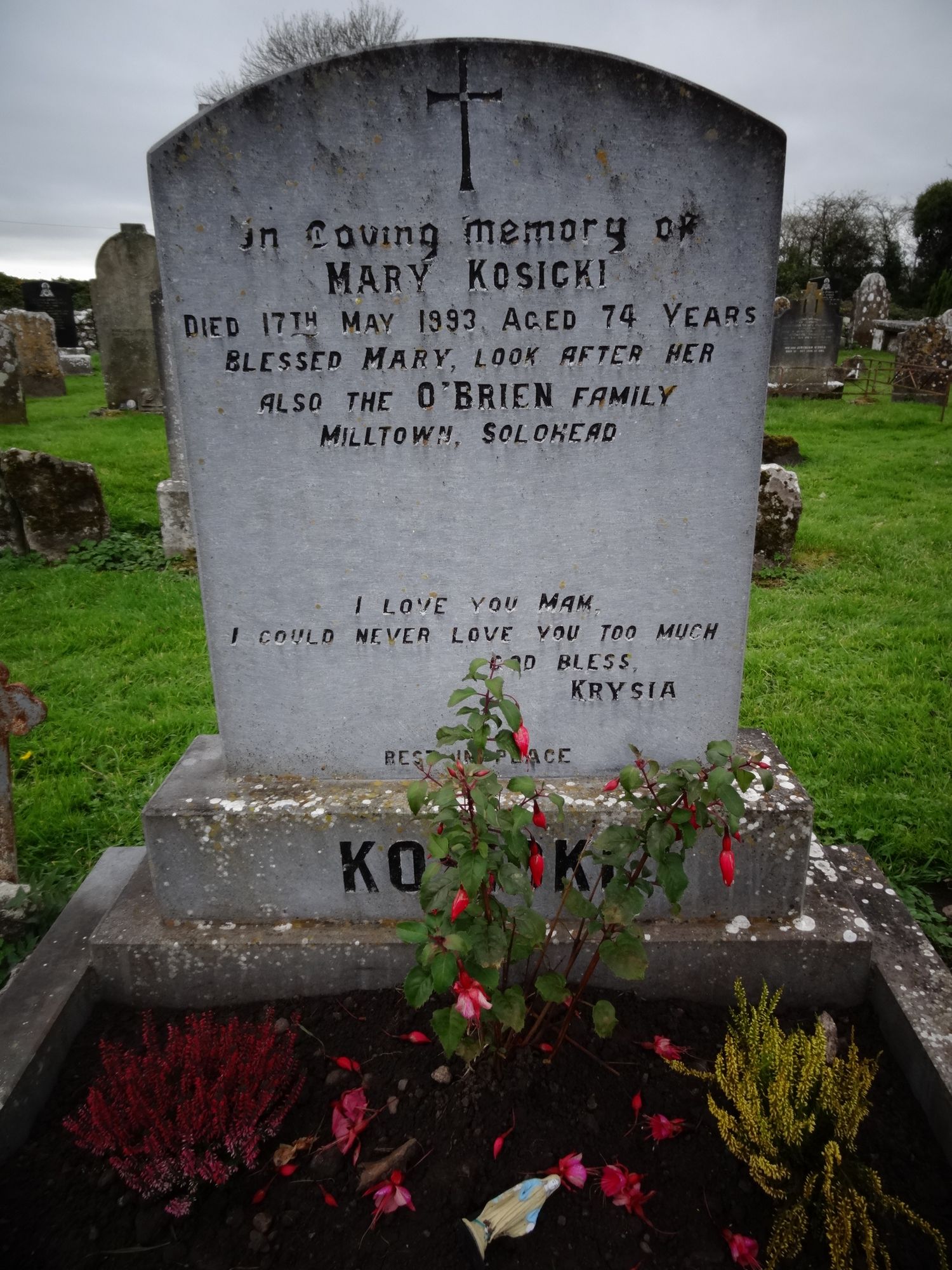 In loving memory of Mary Kosicki died 17th May 1993 aged 74 yrs Blessed Mary, look after her also the O'Brien family Milltown, Solohead