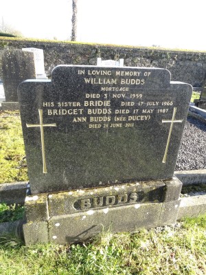 In loving memory ofWilliam Budds, Mortagagedied 3 Nov 1959His sister Bridie died 17 July 1966 Bridget Budds died 17 May 1987Ann Budds (nee Ducey)died 29 June 2011