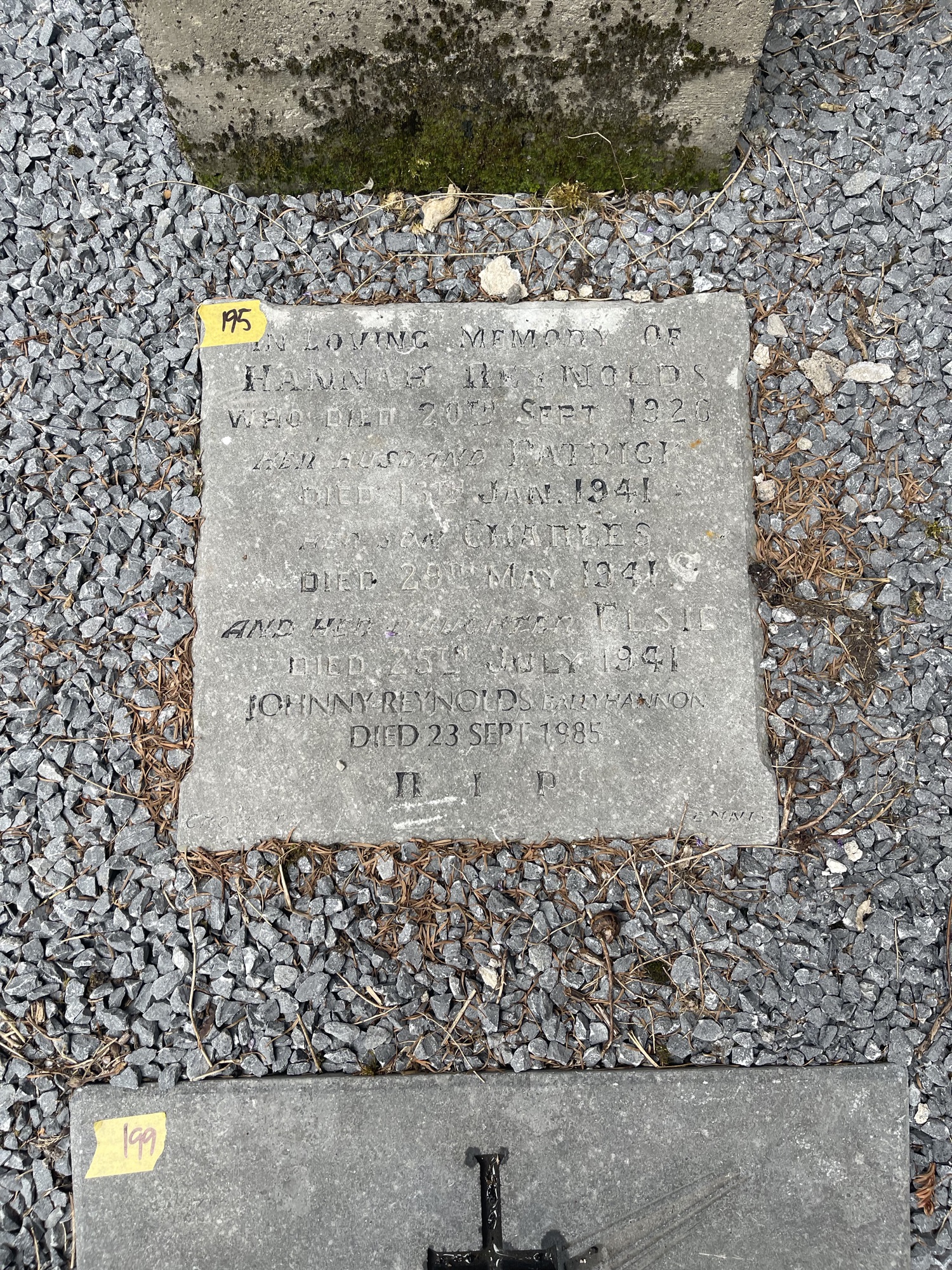 IN LOVING MEMORY OF HANNAH REYNOLDS WHO DIED 20TH SEPT 1926 HER HUSBAND PATRICK DIED 13TH JAN.1941 HER SON CHARLES DIED 29TH MAY 1941 AND HER DAUGHTER ELSIE DIED 25TH JULY 1941 JOHNNY REYNOLDS, BALLYHANNON DIED 23 SEPT 1985