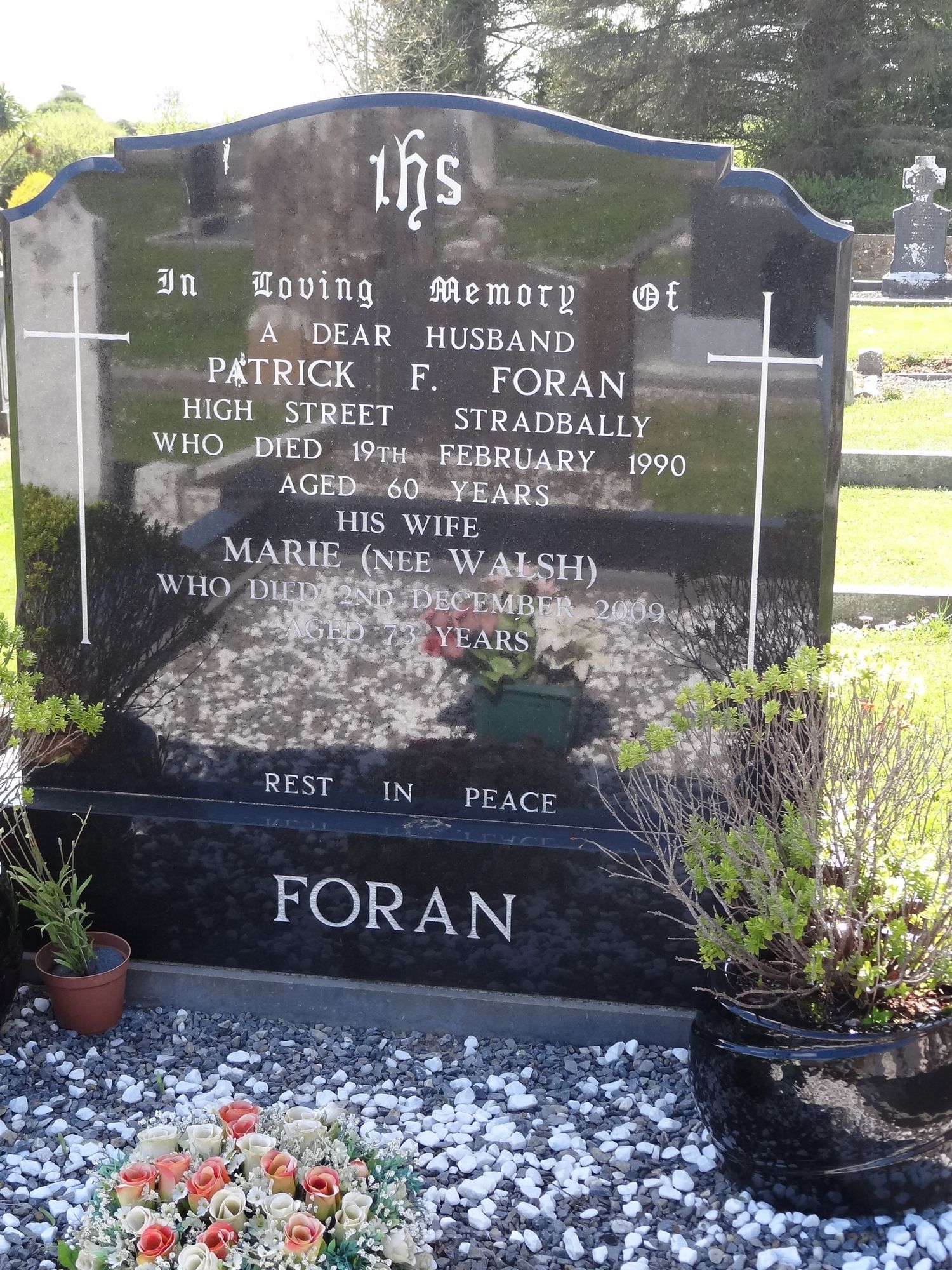 In loving memory ofa dear husbandPatrick F. ForanHight Street Stradballywho died 19th February 1990aged 60 years.His wifeMarie (nee Walsh)who died 2nd December 2009aged 73 years.