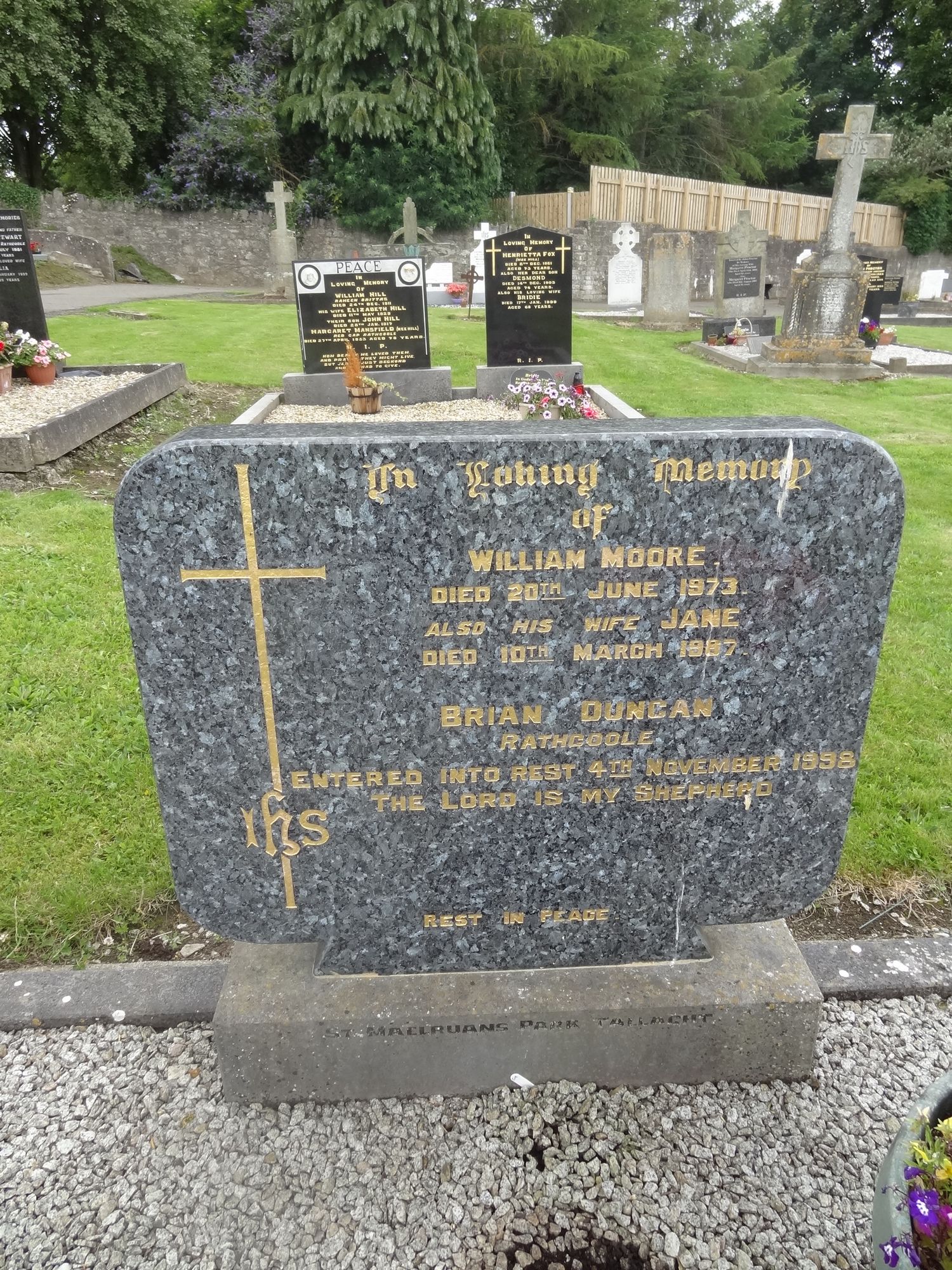 In Loving MemoryOfWilliam MooreDied 20th June 1973Also his wife JaneDied 10th March 1987Brian DuncanRathcooleEntered into rest 4th December 1988The Lord is my Shepherd
