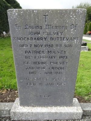 IN LOVING MEMORY OF JOHN MULVEY KNOCKBARRY BUTTEVANT DIED 7 NOV 1950 HIS SON PATRICK MULVEY DIED 8 JANUARY 1973 KATHERINE MULVEY BANOGUE CROOM DIED 17 JUNE 1946 MARGARET MULVEY DIED 18 JAN 1982