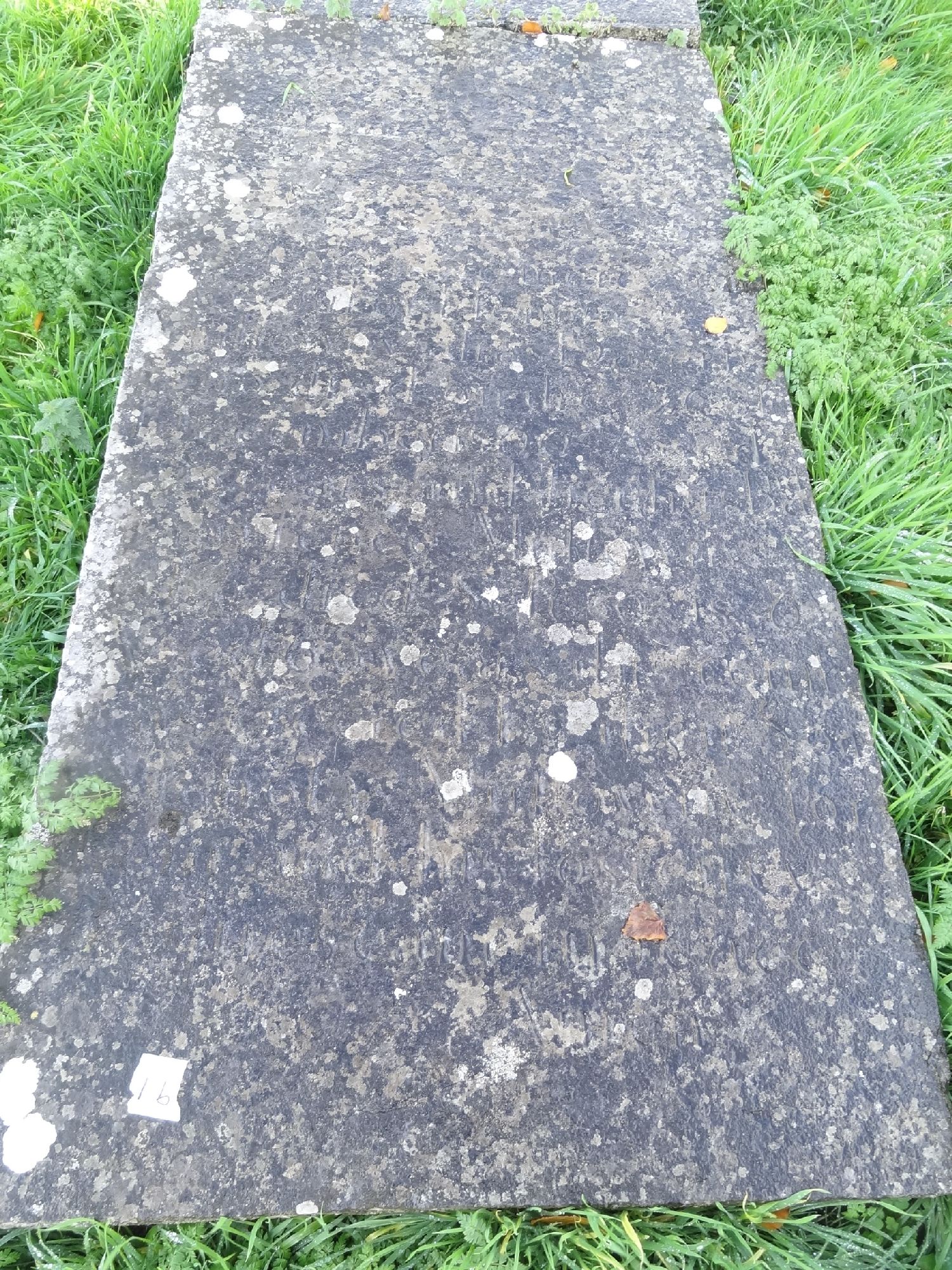 This east facing square top limestone slab measures 6ft4ins(H) x 3ft2ins(W) x 7ins(D). The inscription is simply incised Roman lettering and the mason has used the space saving abbreviation husband for husband . Under a sunburst arch at the the top of the stone, in false relief, is a christogram intersected by a cross. Although the gravestone gives Hanora's death as 20 December 1800, the church record gives her death as 21 December 1799. Further detail from church records show that Laurence Mullowny of Kilcloggaun and Honor Davern of Ballinahallia were married in Moycullen on 19 July 1795. Their son Nicholas, of Kilcloggaun, was baptised in Moycullen church on 26 August 1797.