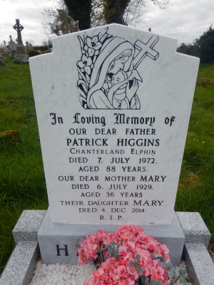 In loving memory of our dear fatherPatrick Higgins, Chanterland Elphin, died 7 July 1972 aged 88 yearsOur dear mother Mary, died 6 July 1929 aged 36 yearsTheir daughter Mary, died 4 Dec 2014