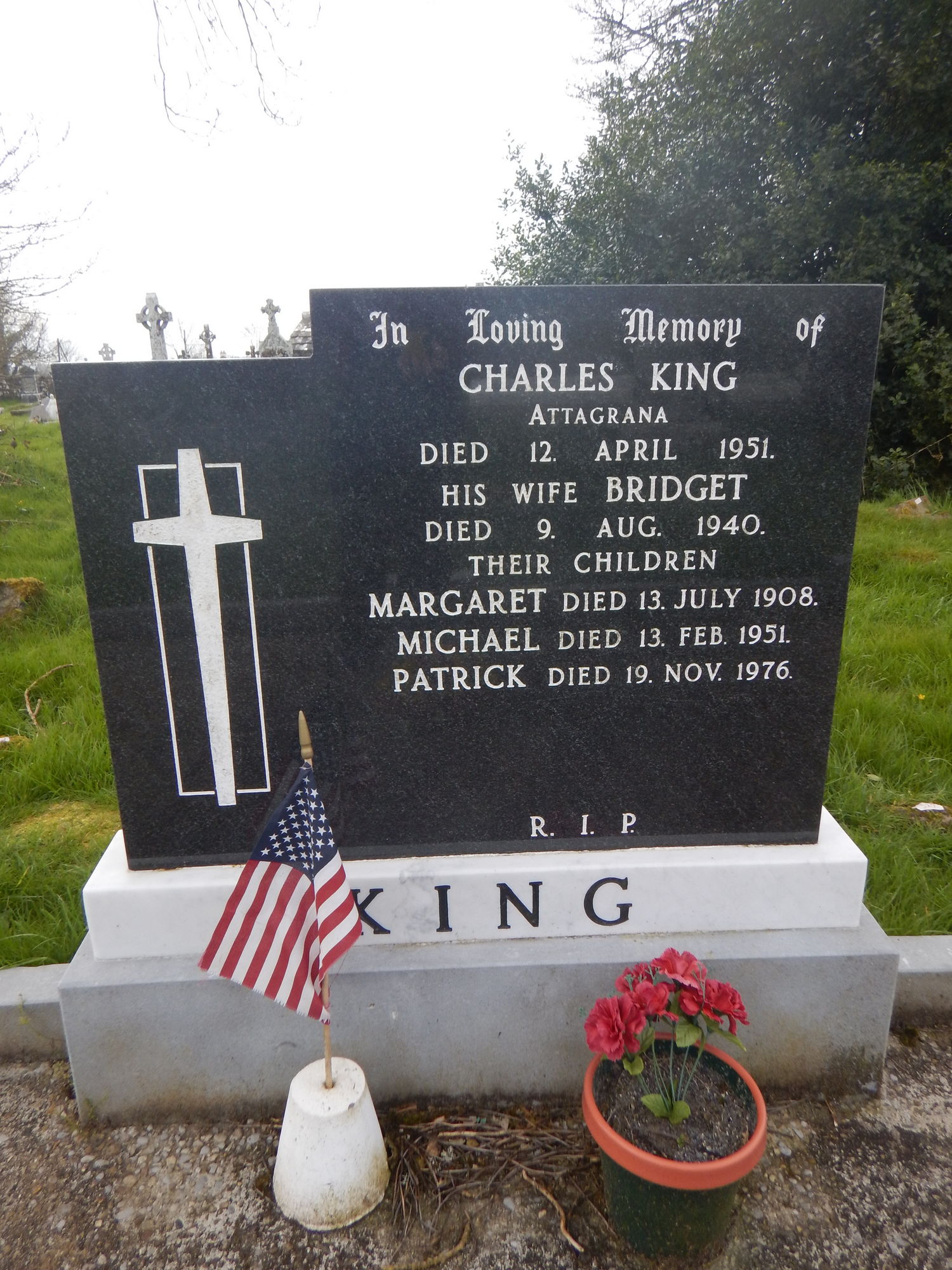 In loving memory of Charles King, Attagrana, died 12 April 1951His wife Bridget, died 9 Aug 1940Their childrenMargaret, died 14 July 1908Michael, died 13 Feb 1951Patrick, died 19 Nov 1976