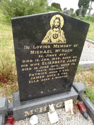 In loving memory of Michael McHugh, 56 Jinks Ave, died 15th Jan. 1936 aged 45. His wife Elizabeth Jane died 10th June 1973 aged 72. Their children Patrick aged 7 yrs. James aged 3 years. Ella aged 3 months. McHugh.