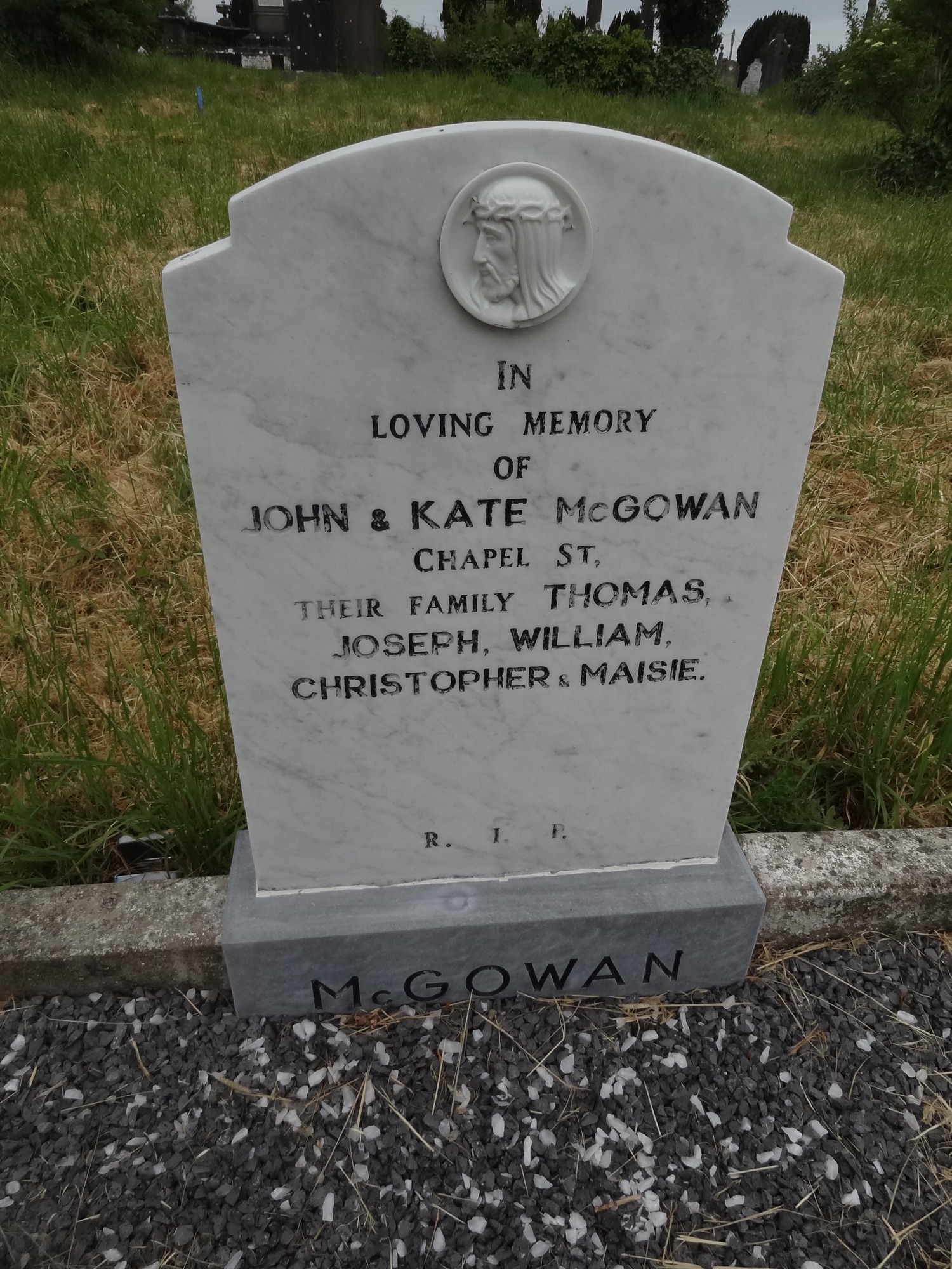 In loving memory of John and Kate McGowan, Chapel St., their family Thomas, Joseph, William, Christopher and Maisie McGowan. R.I.P.