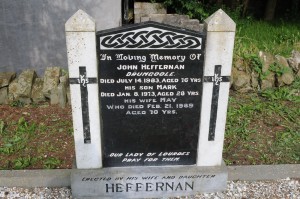 In loving memory of John Heffernan, Drumgoole, died July 14. 1983 aged 76 yearsHis son Mark died Jan 8. 1973 aged 28 yearsHis wife May who died Feb 21. 1989 aged 70 years