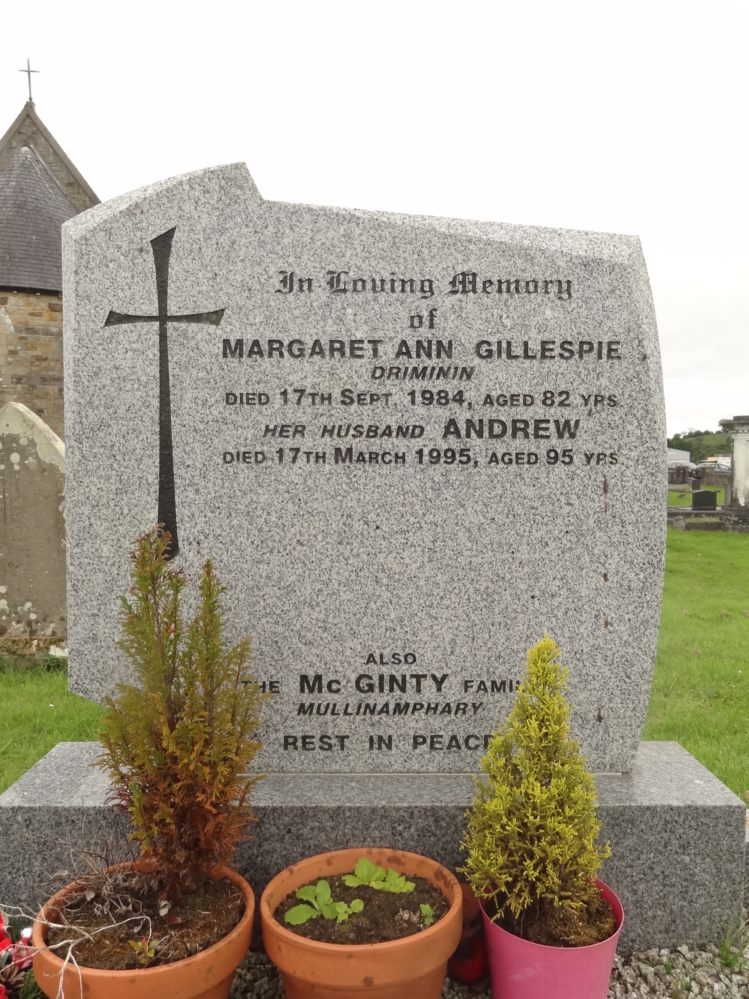 In Loving Memory OF MARGARET ANN GILLESPIE DRIMININ DIED 17TH SEPT, 1984, AGED 82 YRS HER HUSBAND ANDREW DIED 17TH MARCH 1995, AGED 95 YRSALSO THE Mc GINTY FAMILY MULLINAMPHARY REST IN PEACE