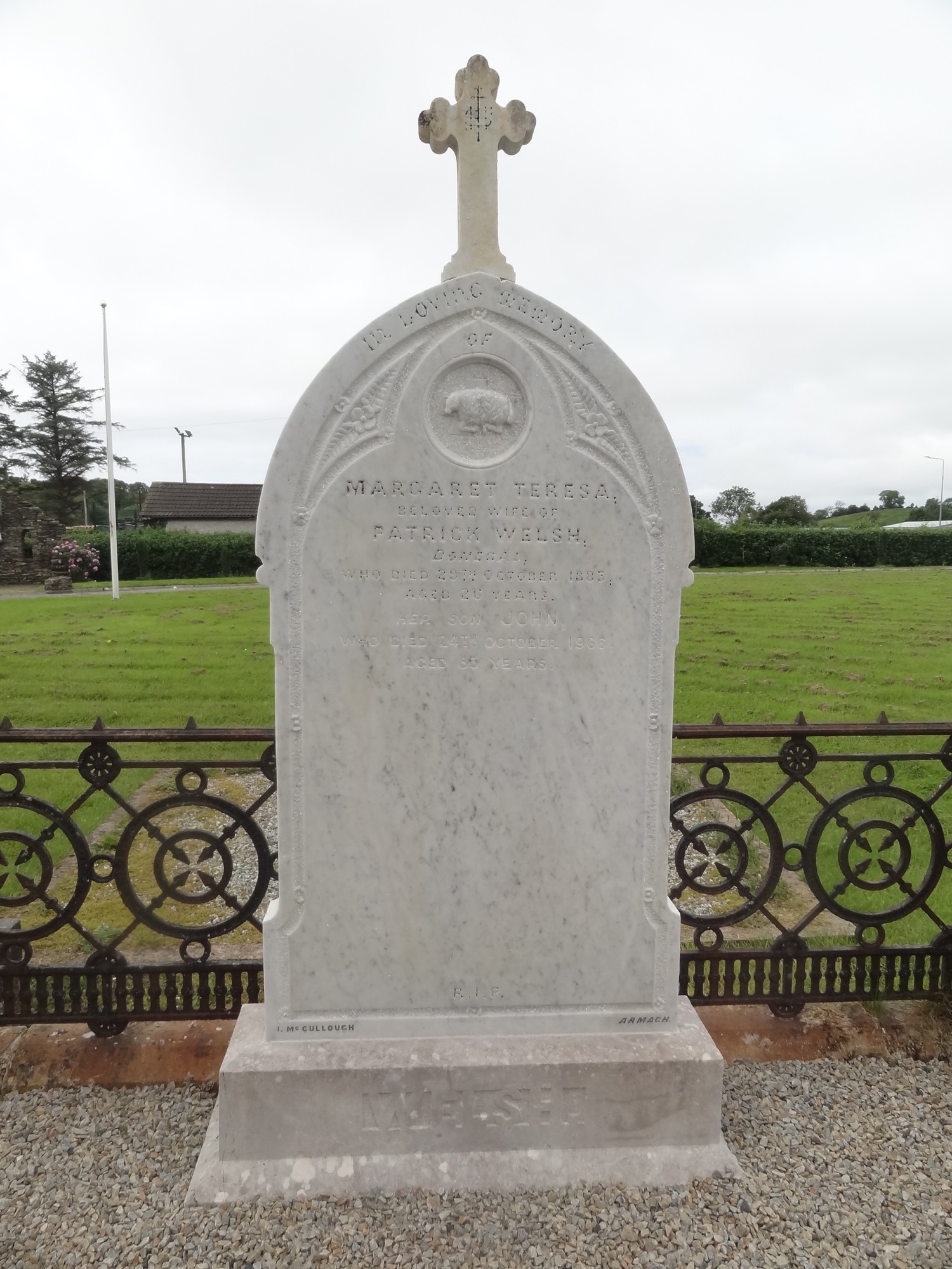 IHS IN LOVING MEMORY OF MARGARET TERESA WELSH BELOVED WIFE OF PATRICK WELSH, DONEGAL WHO DIED 20TH OCTOBER1883, AGED 20 YEARS, HER SON JOHN WHO DIED 24TH OCTOBER 1966, AGED 83 YEARS, R.I.P. J. McCullough Armagh (stonemason)WELSH
