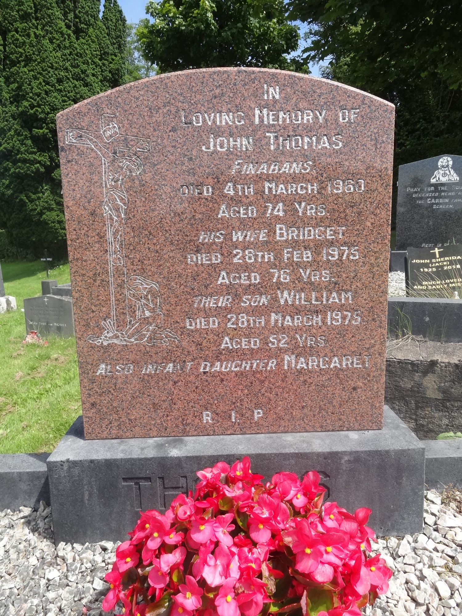 IN LOVING MEMORY OF JOHN THOMAS FINABANS DIED 4TH MARCH 1960 AGED 74 YRS. HIS WIFE BRIDGET DIED 28TH FEB 1975 AGED 76 YRS. THEIR SON WILLIAM DIED 28TH MARCH 1975 AGED 52 YRS. ALSO INFANT DAUGHTER MARGARET. R.I.P. THOMAS