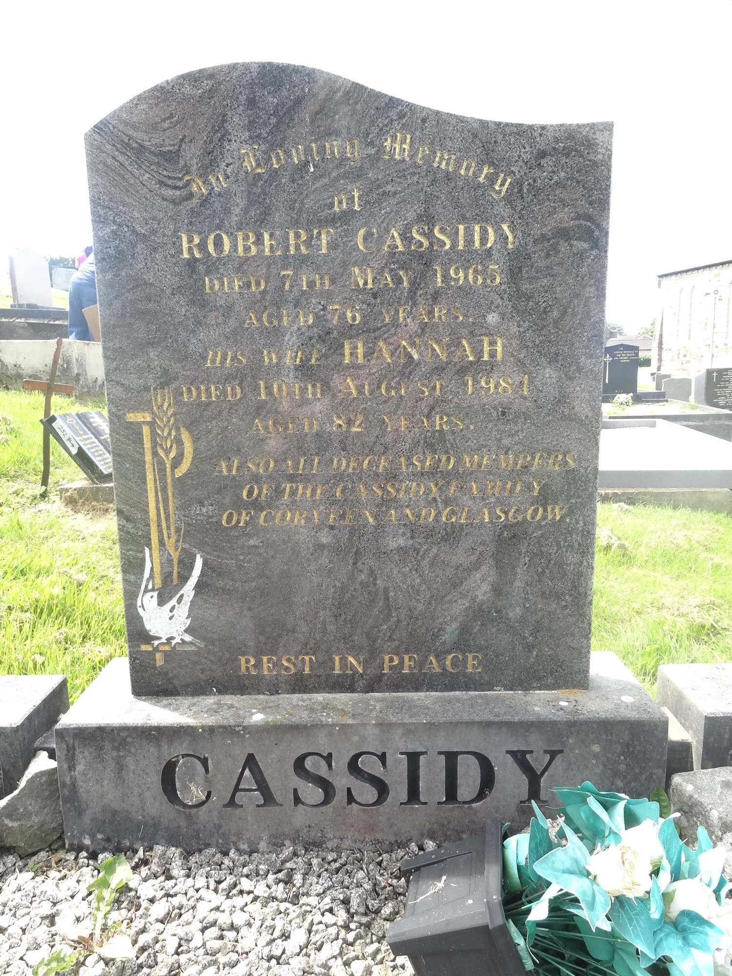 IN LOVING MEMORY OF ROBERT CASSIDY DIED 7th MAY 1965 AGED 76 YEARS HIS WIFE HANNAH DIED 10th AUGUST 1984 AGED 82 YEARS ALSO ALL DECEASED MEMBERS OF THE CASSIDY FAMILY OF CORVEEN AND GLASGOW REST IN PEACE