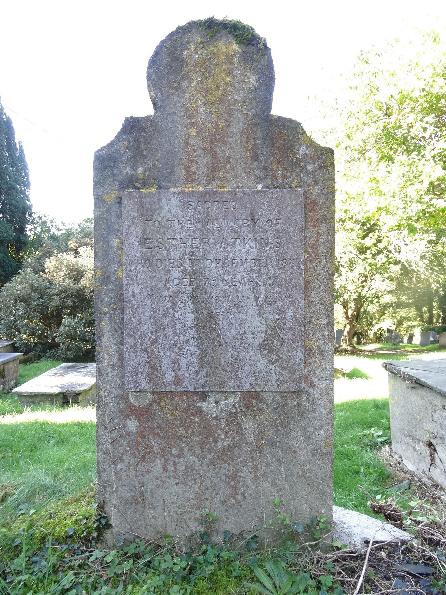 SACREDTO THE MEMORY OFESTER ATKINSWHO DIED 11TH DECEMBER 1887AGED 75 YEARS.May she rest in peaceAMENĀ