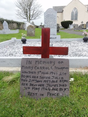Slate marker In memory of Mary Carroll Stoneyford who died 5th August 1947 age 80 yrs. Her sister Julia died 21st Sept 1957 age 83 yrs. Her brother James died 31st May 1964 age 84 yrs. Rest in Peace.