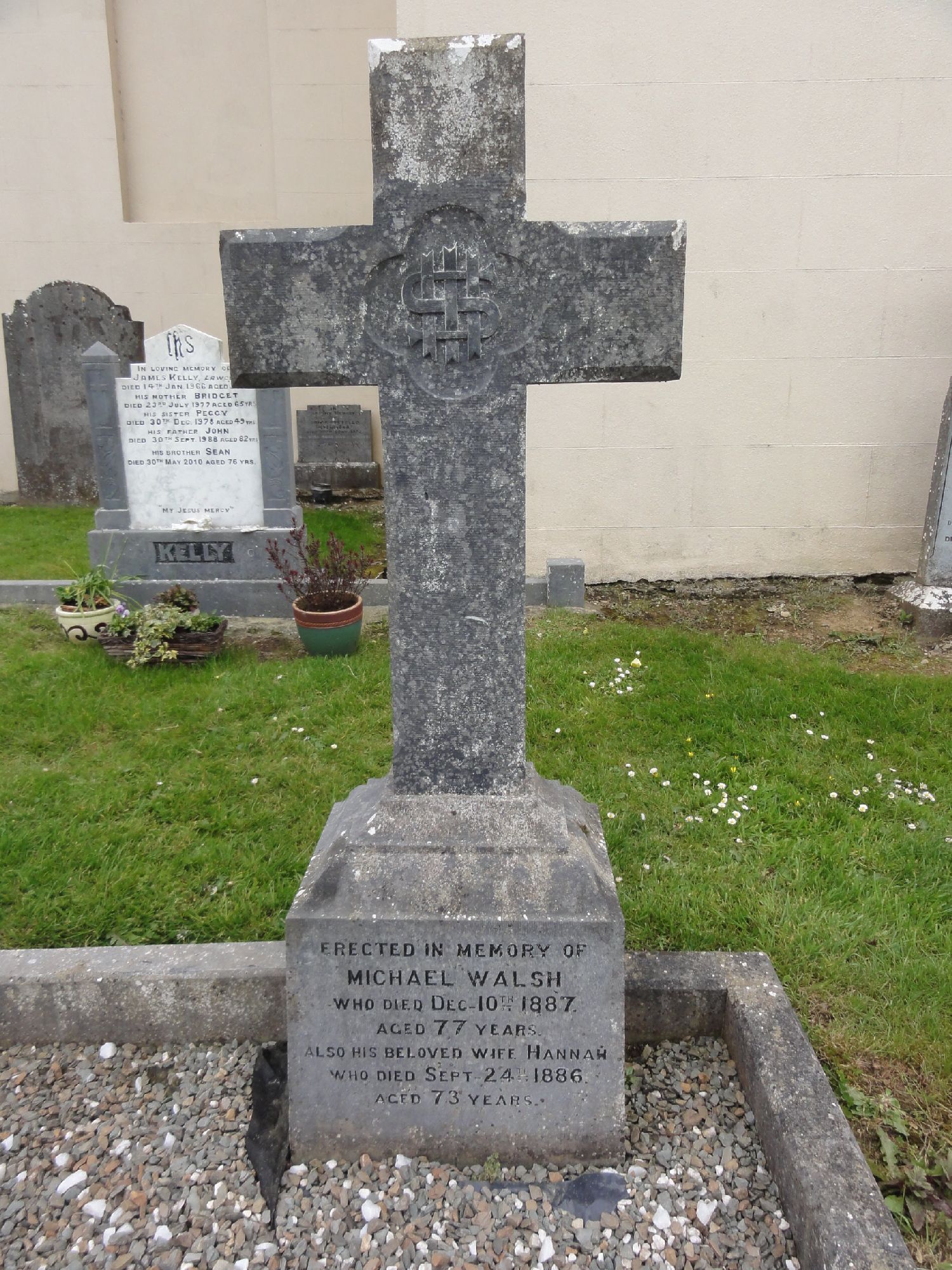 Erected in memory of Michael Walsh who died Dec 10th 1887 aged 77 yrs. Also his beloved wife Hannah who departed Sept 24th 1886 aged 73 yrs R.I.P.