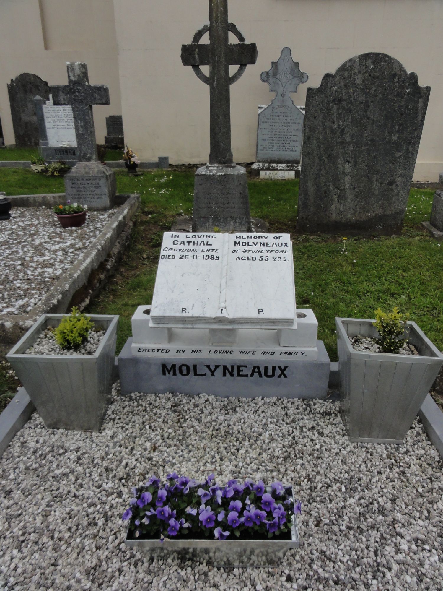 In loving memory of Cathal Molyneaux Croydon late of Stoneyford died 26.11 1989 aged 53yrs. R.I.P. Erected by his loving wife and family. MOLYNEAUX