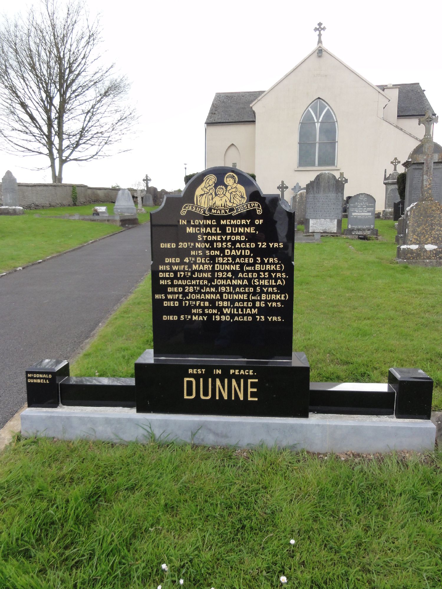 In loving memory of Michael Dunne Stoneyford died 20th Nov 1955 aged 72 yrs. His son David died 4th Dec 1923 aged 3 yrs. His wife Mary Dunne (nee Burke) died 17th June 1924 aged 35 yrs. His daughter Johanna (Sheila) died 28th Jan 1931 aged 5 yrs. His wife Johanna Dunne (nee Burke) died 17th Feb 1981 aged 86 yrs. His son, William died 5th May 1990 aged 73 yrs. Rest in Peace. DUNNE