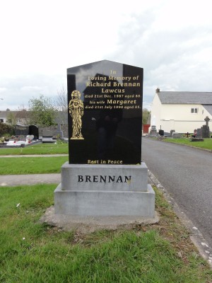 In loving memory of Richard Brennan Lawcus died 21st Dec 1987 aged 80. His wife Margaret died 21st July 1990 aged 85. Rest in Peace. BRENNAN, and BRENNAN at rear of headstone and BRENNAN on foot stone.