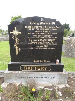 In loving memory of Joseph Raftery, Rathready East, died 22nd Feb. 1948 aged 61 years.