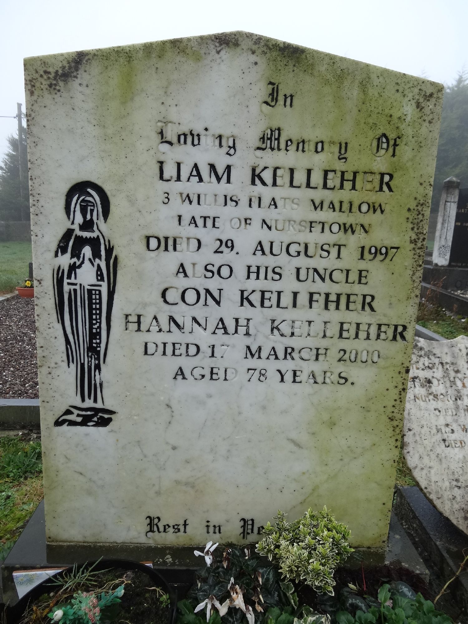 InLoving Memory OfLIAM KELLEHER3 Willis Flats MallowLate of NursetownDied 29. August 1997Also His UncleCON KELLEHERHANNAH KELLEHERDied 17 March 2000Aged 78 Years.