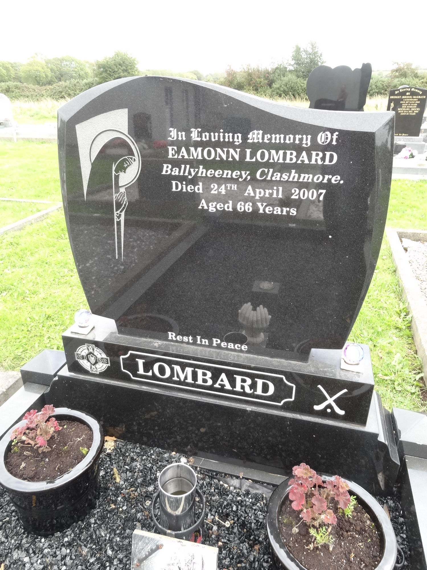 In loving memory ofEamonn Lombard, Ballyheeney, Clashmoredied 24th April 2007aged 66 years