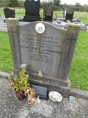 In loving memory of Jerry McCarthy, 92 Pearse Rd, Ballyphehanedied 11 Jan 1987His wife Nora nee Ormonddied 12 May 1995Their son Patdied 19 Dec 2002Interred in Cobh