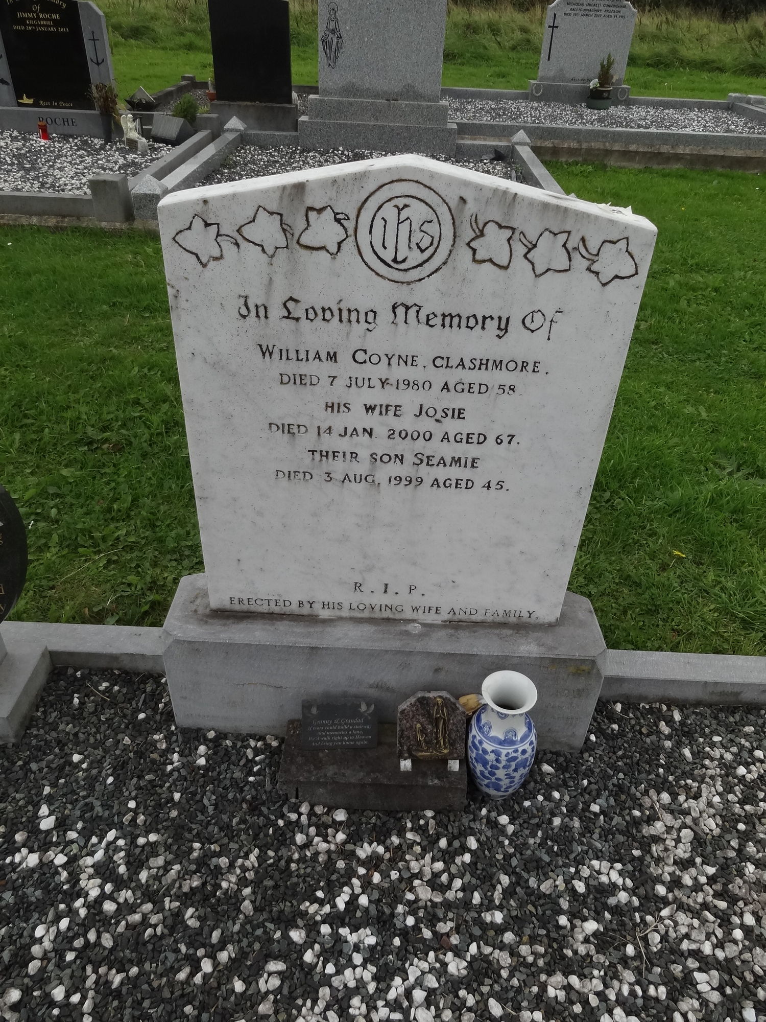 In loving memory ofWilliam Coyne, Clashmoredied 7 July 1980 aged 58His wife Josiedied 14 Jan 2000 aged 67Their son Seamiedied 3 Aug 1999 aged 45