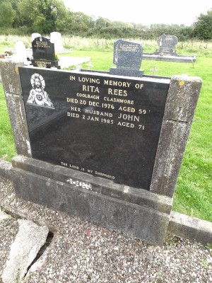 In loving memory ofRita Rees, Coolbagh, Clashmoredied 20 Dec 1976 aged 59Her husband Johndied 2 Jan 1985 aged 71
