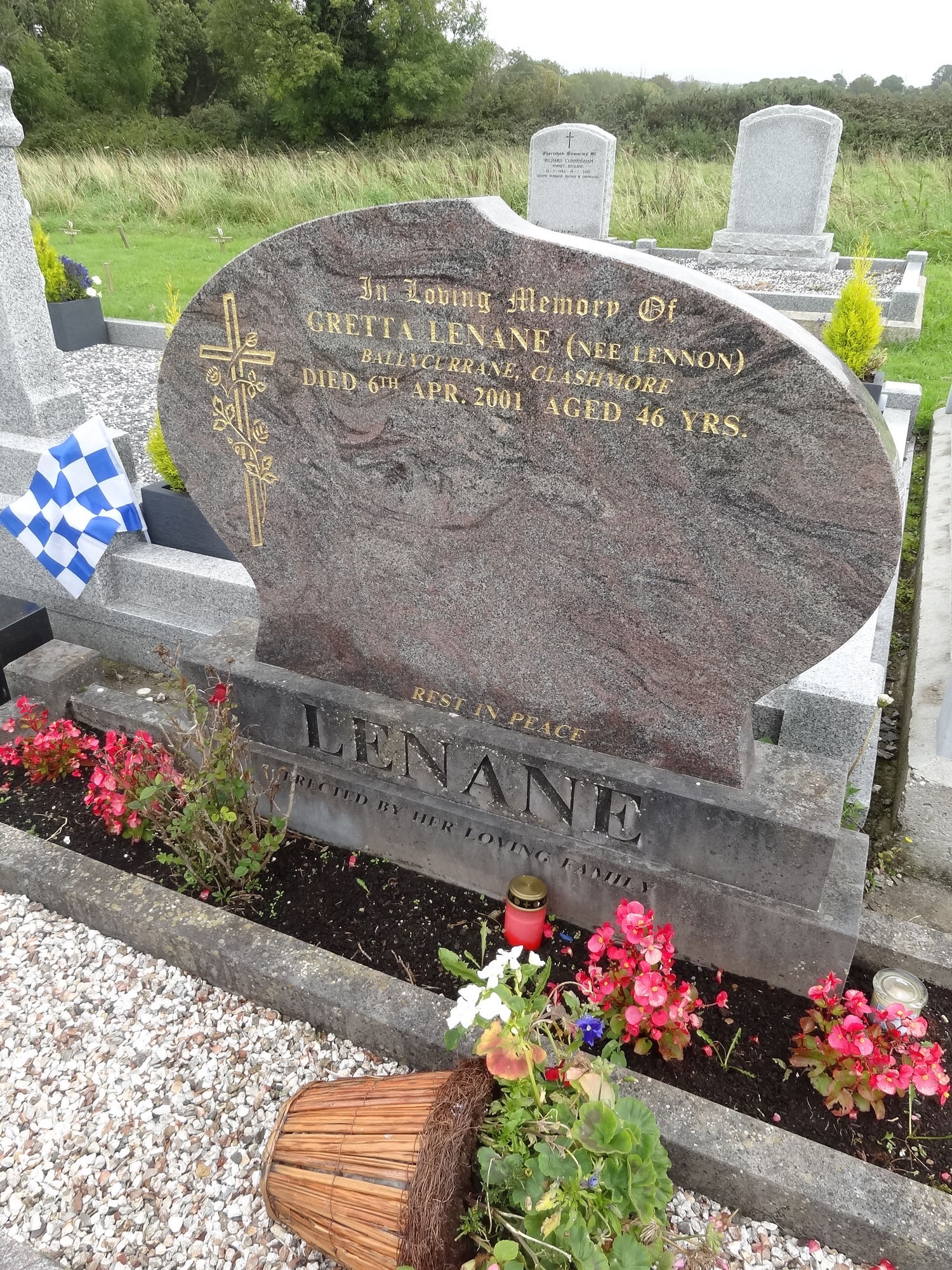 In loving memory ofGretta Lenane (nee Lennon)Ballycurrane, Clashmoredied 6th Apr 2001 aged 46 years