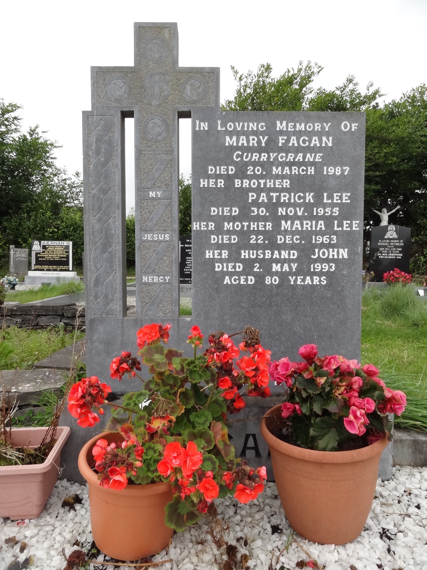 In loving memory ofMary FaganCurrygranedied 20. March 1987Her brother Patrick Leedied 30. Nov 1955Her mother Maria Leedied 22. Dec 1963Her husband Johndied 2. May 1993aged 80 yearsÂ