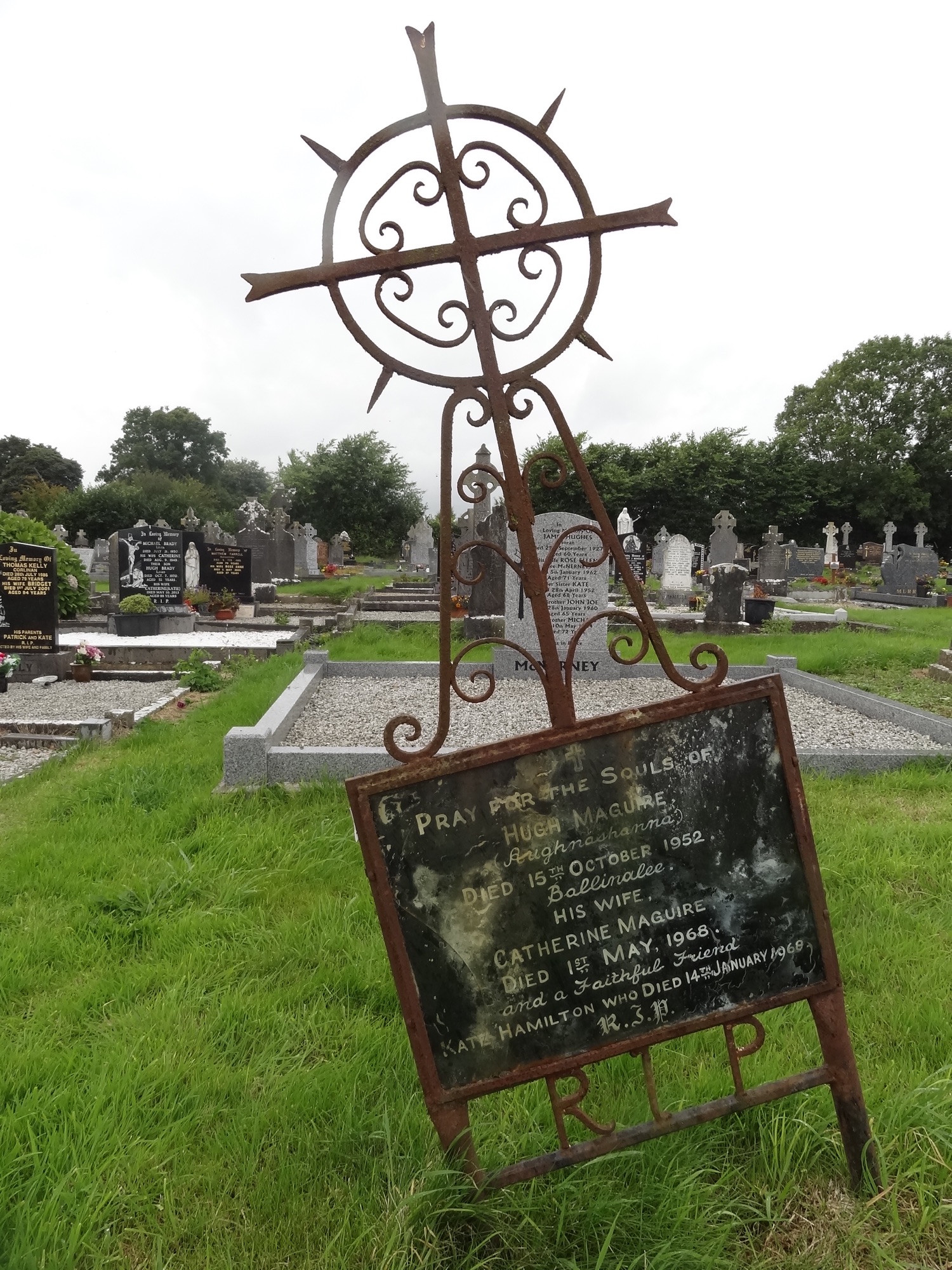 Pray for the souls ofHugh MaguireAughnashannadied 15th October 1952BallinaleeHis wifeCatherine Maguiredied 1st May 1968and a faithful friendKate Hamilton who died 14th January 1968R.I.P.