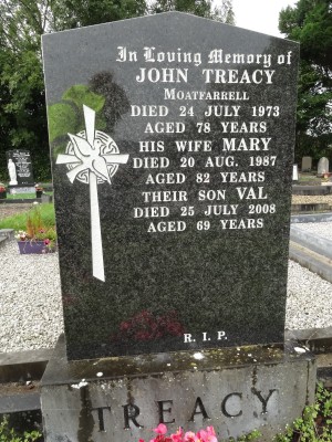 In loving memory ofJohn TreacyMoatfarrelldied 24 July 1973aged 78 yearsHis wife Marydied 20 Aug 1987aged 82 yearsTheir son Valdied 25 July 2008aged 69 years