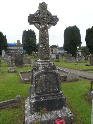 LEFT SIDE FACING SHOP- ALSO JAMES D’ARCY TIPPERARY DIED JULY 4TH 1919, ELLEN D’ARCY WIFE OF C. J. D’ARCY DIED DEC 4TH 1943 RIGHT SIDE FACING SHOP ALSO MICHAEL D’ARCY, LACKA DIED JUNE 15 1864 AGED 64, HIS BELOVED WIFE MARGARET DIED MARCH 9-1872 AGED 72, ANNE D’ARCY MOTHER DIED FEB 18TH 1902 AGED 57 YEARS BACK FACING SHOP CHARLES D’ARCY DIED 4TH DEC 1951 THIS LARGE CELTIC FORM CROSS HAS PASSION FLOWER AND LILY DECORATION RELIEF ON SHAFT AND IT SITS ON AN INSCRIBED PEDESTAL. THE FLOWER RELIEF IS ON THE FRONT ONLY.