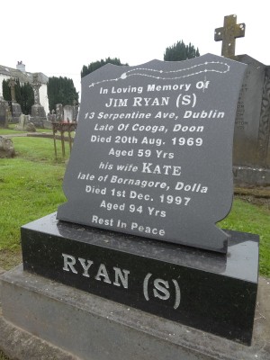 In Loving Memory Of JIM RYAN (S) 13 Serpentine Ave, DublinLate of Cooga, DoonDied 20th Aug. 1969Aged 59 Yrs his wife Kate late of Bornagore, DollaDied 1st Dec. 1997Aged 94 Yrs Rest In Peace Ryan (S)