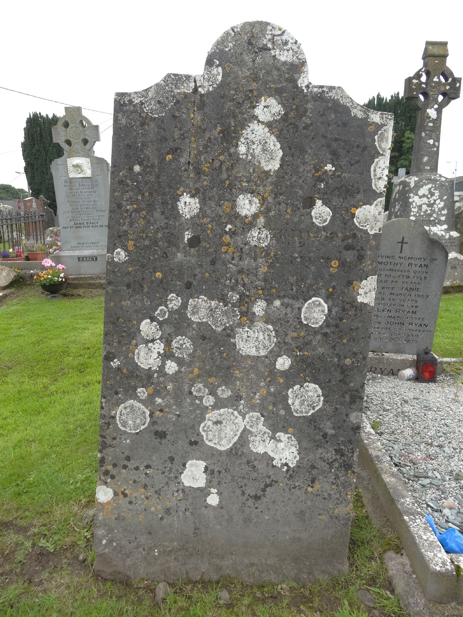Erected by Denis Ryan of ….Alleen (Anacarty parish, Co. Tipperary) in memory of his son Patrick Ryan who depd life Nov 1860 age 2O year… May his soul rest in peace Full length cross carved at back of this stone