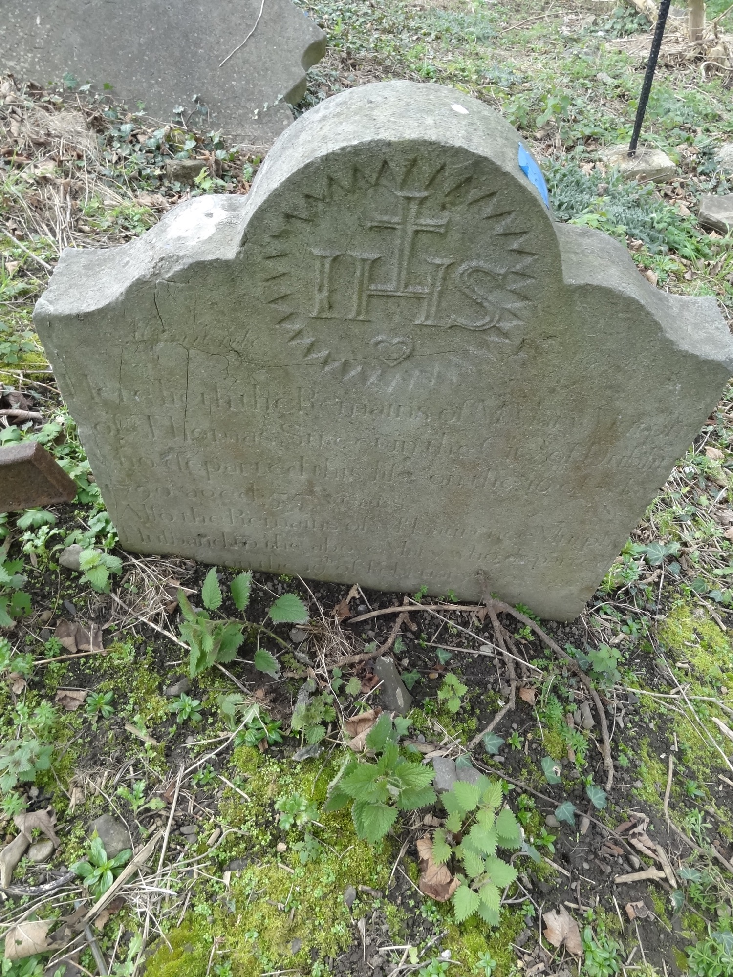 IHS / Memento Mori / Here lieth the Remians of Mrs MARY MURPHY / of Thomas Street in the City of Dublin / who departed this life on the 16th of May / 1790 aged 55 years. / Also the Remains of Mr LAURENCE MURPHY / Husband to the above MARY who departed / this life on the 19 February 1805 aged 8O years. (East Face)