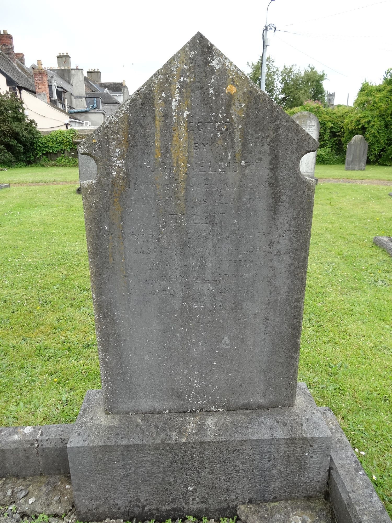 Erected by John Elliott of the Parde Kilkenny, in memory of his beloved wifeEllen, who died on the 2nd day of April 1878Also two infant children who lie interredJohn Elliot, died 16th May 1883 aged 63