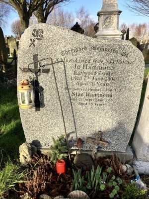 CHERISHED MEMORIES OF A MUCH LOVED WIFE AND MOTHER JO HAMMOND EARLWOOD ESTATE DIED 7th JUNE 2004 AGED 70 YEARS HER BELOVED HUSBAND AND DAD STAN HAMMOND DIED 2nd SEPTEMBER 2016 AGED 85 YEARS