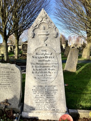 THE BURIAL PLACE OF WILLIAM HURLY AND FAMILY THIS MONUMENT WAS ERECTED BY HIM IN MEMORY OF HIS BELOVED WIFE MARY SHE DEPT THIS LIFE MAY 1856 AGED 56 YEARS MAY HER SOUL REST IN PEACE AMEN IN LOVING MEMORY OF OUR DEAR MOTHER