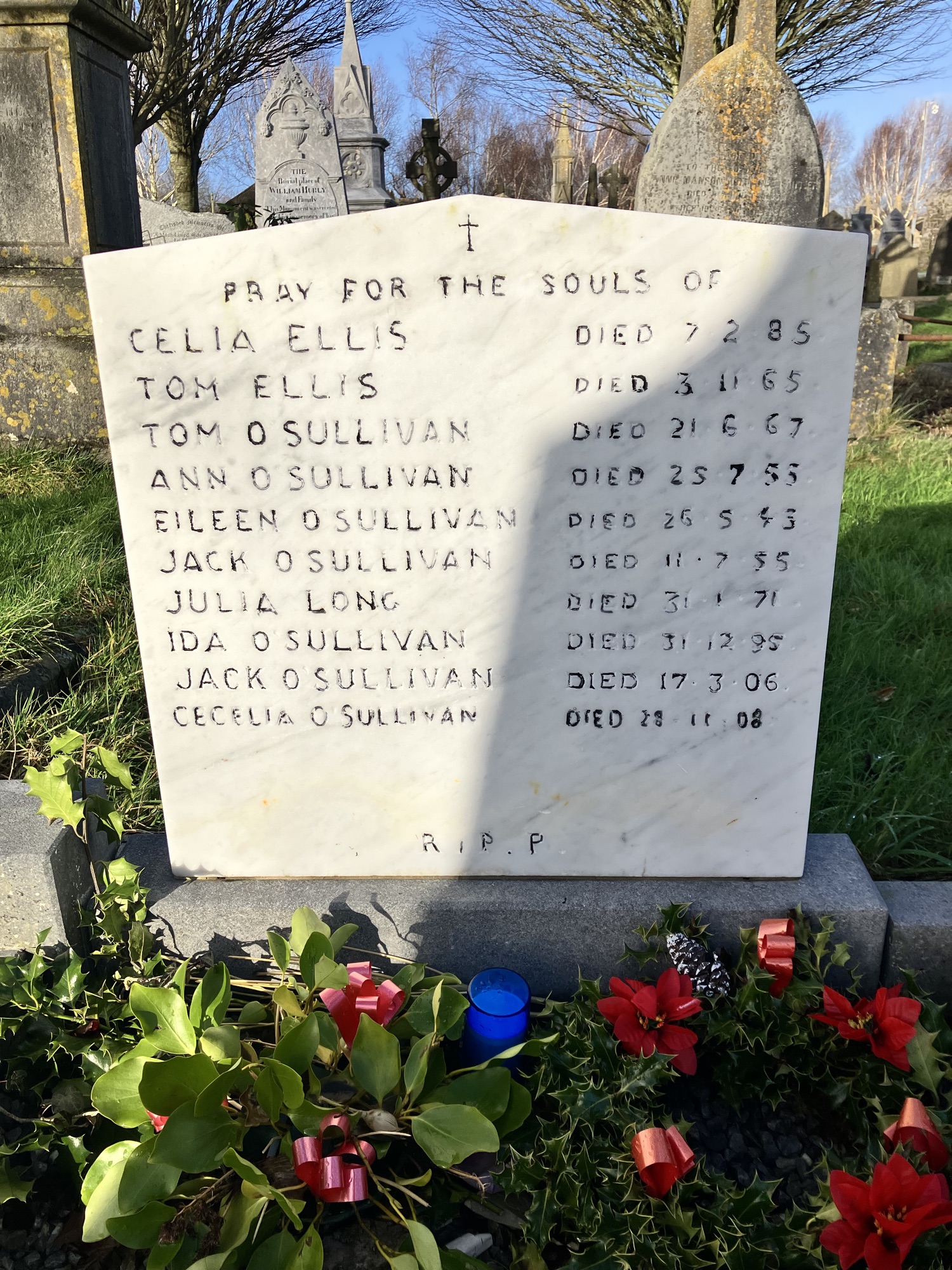 PRAY FOR THE SOULS OF CELIA ELLIS DIED 7-2-88 TOM ELLIS DIED 3/11/65 TOM O SULLIVAN DIED 21-8-67 ANN O SULLIVAN DIED 25-7-38 EILEEN O SULLIVAN DIED 26-6-43 JACK O SULLIVAN DIED 11-7-85 JULIA LONG DIED 31-1-71 IDA O SULLIVAN DIED 31-12-95 JACK O SULLIVAN DIED 17-3-06 CECELIA O SULLIVAN DIED 28-11-08 RIP