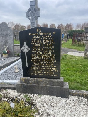 In loving memory of Mary Casey died 19 Dec 1917 Maura Power died 23rd Nov 1942 John P. Lane died 26th Jan 1952 Cecilia Lane died 26th Jan 1954 Jack Ryan died 1st March 1960 Hugh O’Donnell died 29th Nov 1938 Tara O’Donnell died 29th Feb 1984 Hugh Ryan died 8th May 1988 Robert (Bob) Seward died 12th May 1994 Cecilia Seward died 12th Aug 1925 th Aug 2010