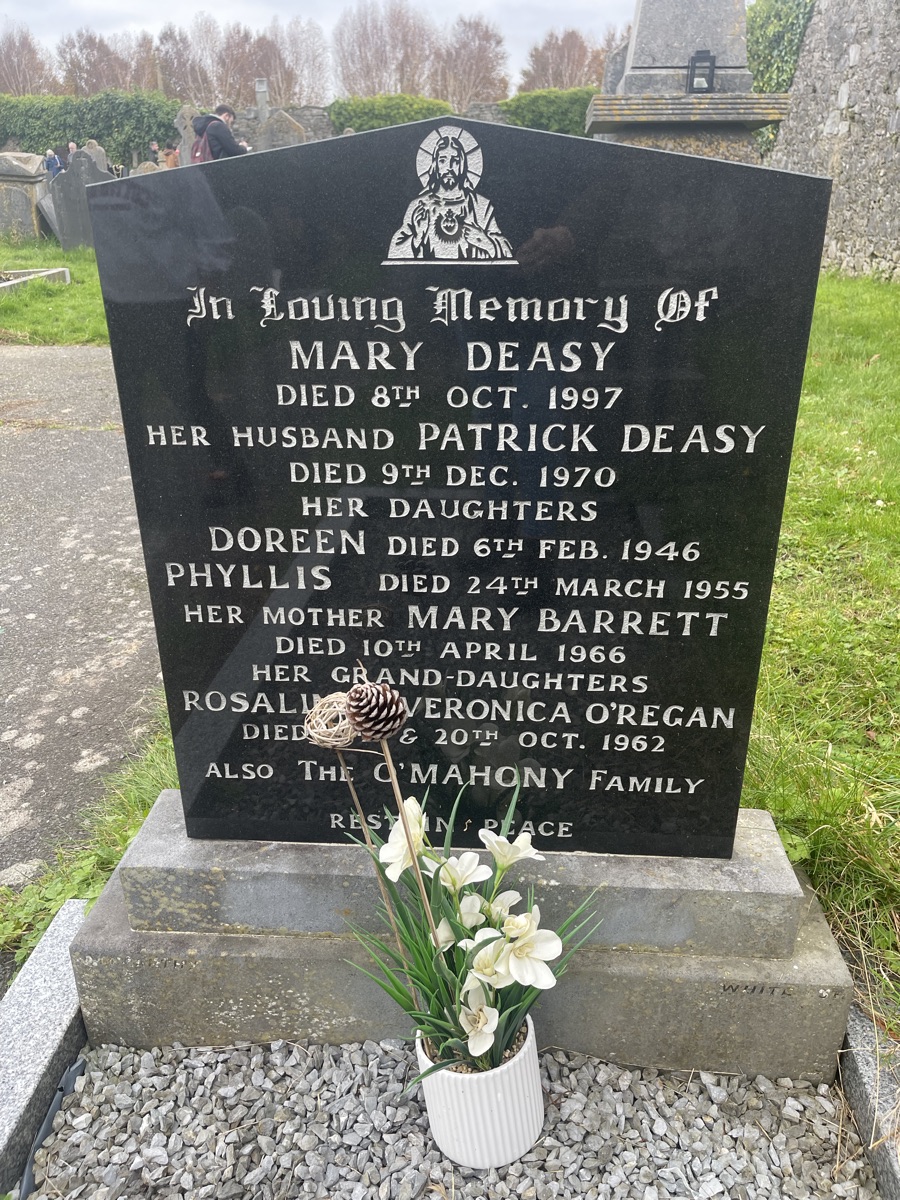 In Loving Memory of Mary Deasy Died 8th Oct. 1997 Her Husband Patrick Deasy Died 9th Dec. 1970 Her Daughters Doreen died 6th Feb. 1946 Phyllis Died 24th March 1955 Her Mother Mary Barrett Died 10th April 1906 Her Grand-Daughters Rosalind & Veronica O'Regan Died 19th & 20th Oct. 1961 Also the O'Mahony Family R.I.P.