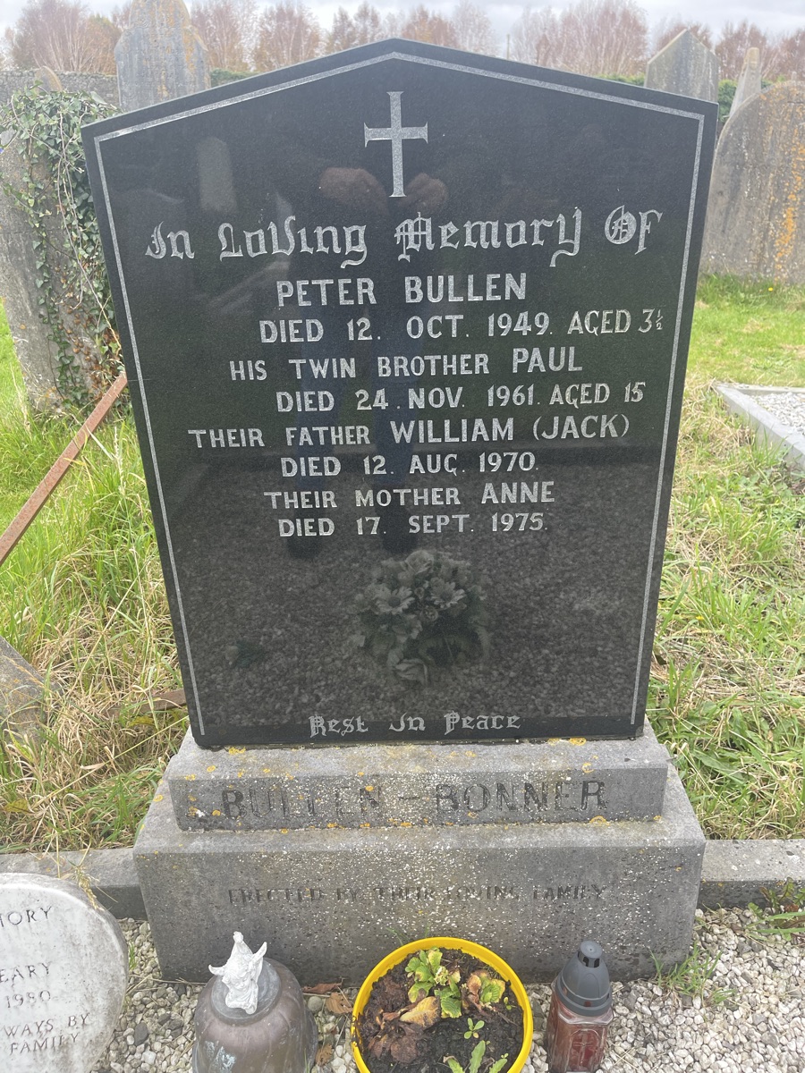 IN LOVING MEMORY OF PETER BULLEN DIED 12 OCT 1949 AGED 3½ HIS TWIN BROTHER PAUL DIED 24 NOV 1961 AGED 15 THEIR FATHER WILLIAM (JACK) DIED 12 AUG 1976 THEIR MOTHER ANNE DIED 17 SEPT 1975 REST IN PEACE