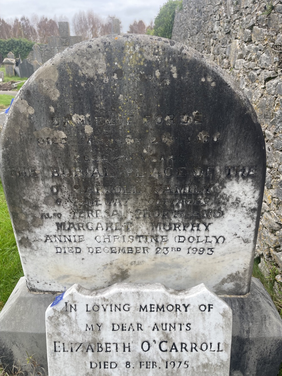 In Memory of Daniel FORDE died January 20th 1900 Aged 80 years. The burial place of the O'Carroll family 6 Palewav Cottages. Also Teresa Shortland Margaret Murphy Annie Christine (Dolly) Died December 23 1993.