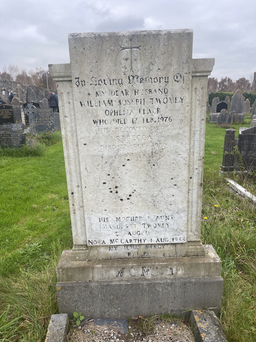 IN LOVING MEMORY OF MY DEAR HUSBAND WILLIAM JOSEPH TWOMEY OPHELIA PLACE WHO DIED 17 FEB. 1976 HIS BELOVED WIFE REBECCA DIED 22 FEB. 1985 HIS MOTHER AUNT MARGARET TWOMEY 23 AUG. 1910 NORA MCCARTHY 1 AUG. 1933 MY JESUS MERCY R. I. P.