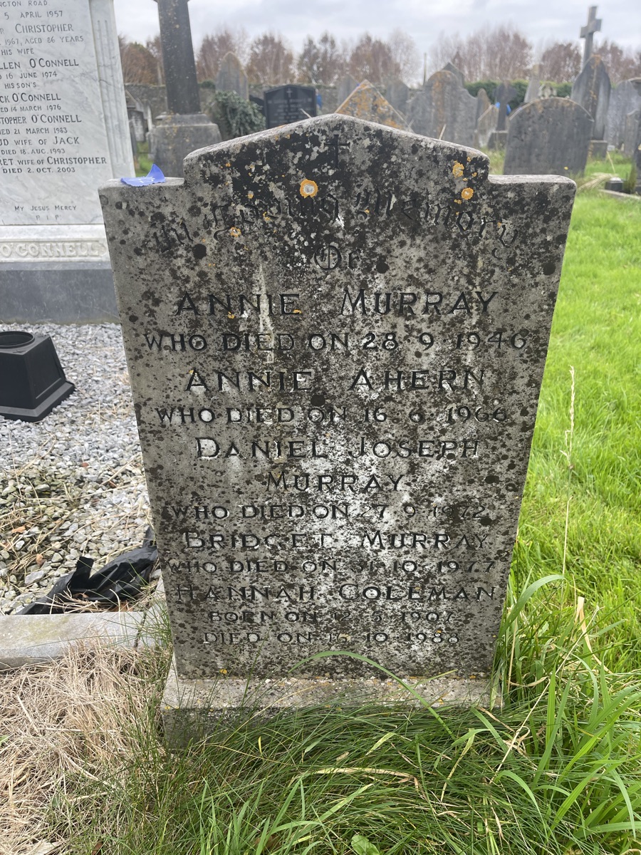 IN LOVING MEMORY OF ANNIE MURRAY WHO DIED ON 28.9.1946 ANNIE AHERN WHO DIED ON 16.6.1966 DANIEL JOSEPH MURRAY WHO DIED ON 27.9.1972 BRIGET MURRAY WHO DIED ON 31.10.1977 HANNAH COLEMAN BORN ON 12.5.1907 DIED ON 16.10.1988