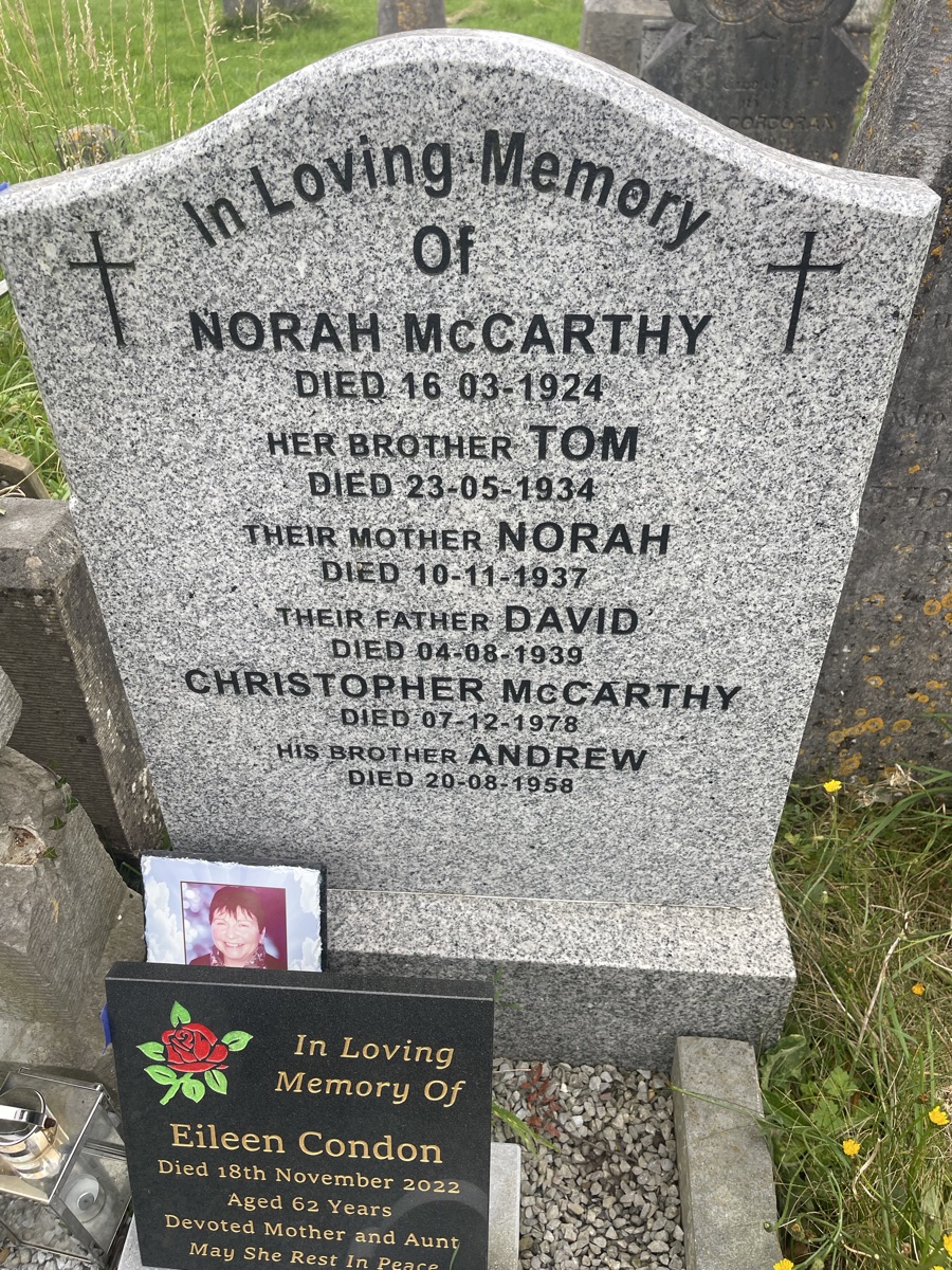 IN LOVING MEMORY OF NORAH MCCARTHY DIED 16-3-1924 HER BROTHER TOM DIED 23-5-1934 THEIR MOTHER NORAH DIED 10-11-1937 THEIR FATHER DAVID DIED 4-8-1939 CHRISTOPHER MCCARTHY DIED 7-12-1978 HIS BROTHER ANDREW DIED 20-8-1958