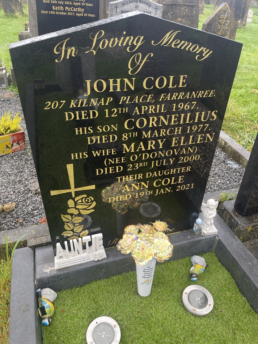 In loving Memory of John Cole 207 Kilnap Place, Farranree Died 12th April 1967 His Son, Cornelius Died 8th March 1977 His Wife Mary Ellen (née O'Donovan) Died 23rd July 2000 Their daughter Ann Cole Died 19th Jan 2021 Rest in peace